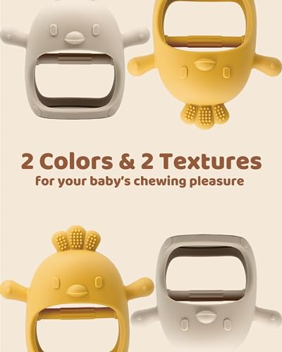 2 Packs Baby Teething Toy for 0-6 6-12 months, Food Grade Silicone Teething Mitten, Anti Dropping Wrist Hand Teethers Baby Chew Toys for Sucking Needs, BPA Free (Green & Caramel)