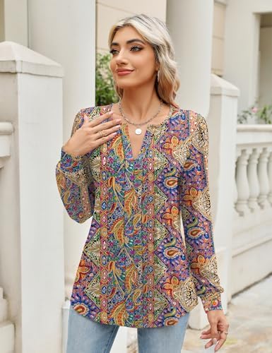 AKEWEI Womens Long Sleeve Shirts Puff Sleeve V Neck Pleated Shirts Loose Fit Blouses for Dressy Casual 2025 Spring Tops