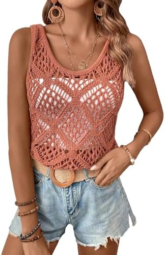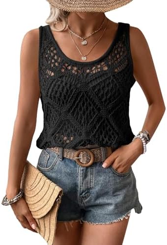 COZYEASE Women's Crochet Tank Tops Knit Sweater Vest Hollow Out Sleeveless Cover Up Summer Boho Top Scoop Neck Pullover