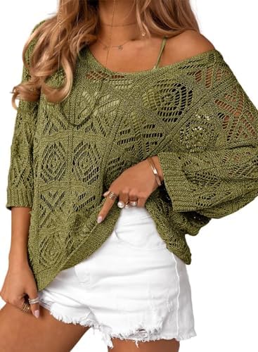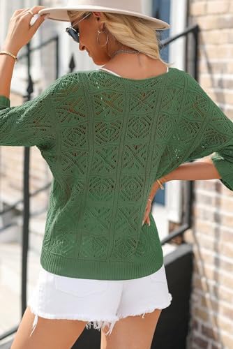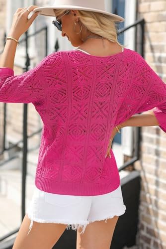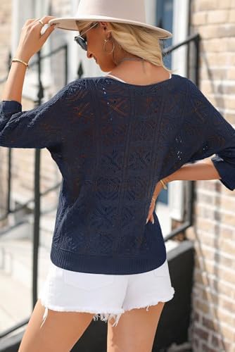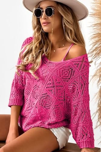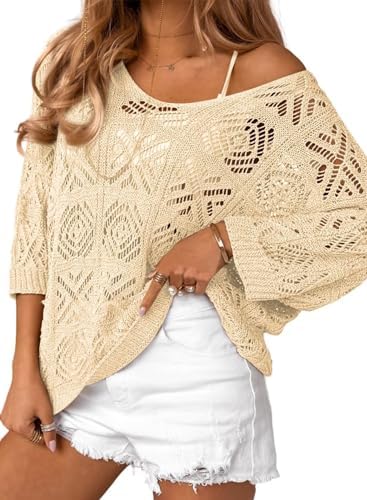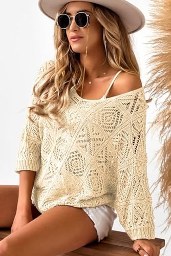 Dokotoo Women's 2024 Spring Summer Crochet Hollow Out 3/4 Sleeve Pullover Sweater Off Shoulder T-Shirts