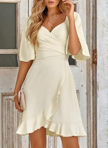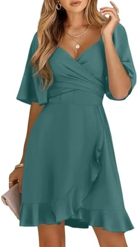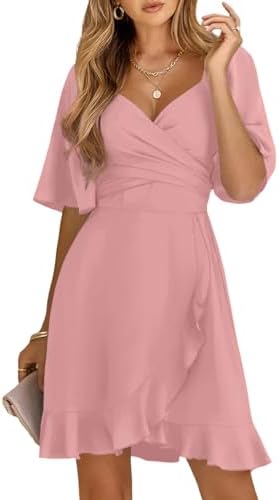 Dokotoo Women's Wrap V Neck Short Flared Sleeve Wedding Guest Dress