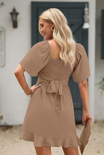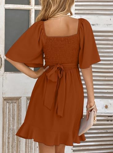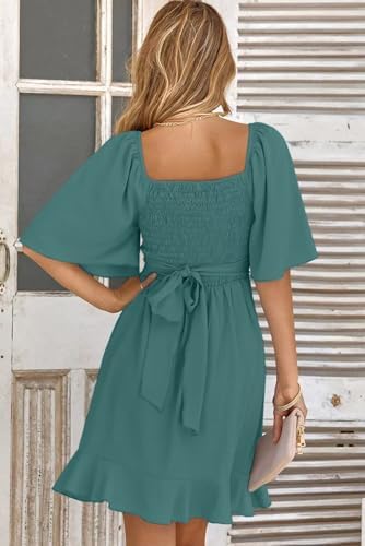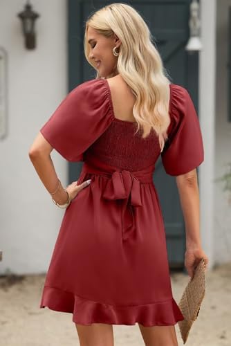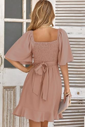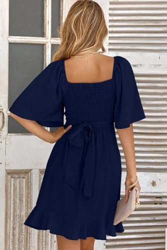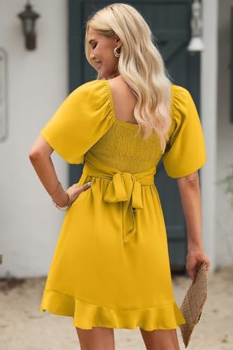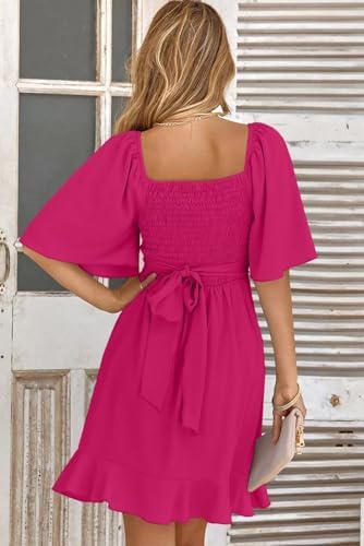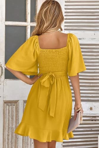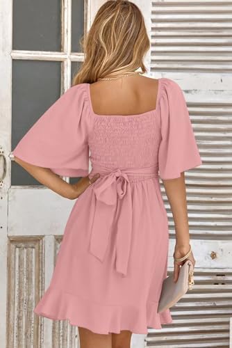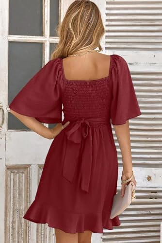 Dokotoo Women's Wrap V Neck Short Flared Sleeve Wedding Guest Dress Smocked Elastic Waist Tiered Belted Ruffle Hem Mini Dress