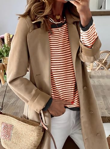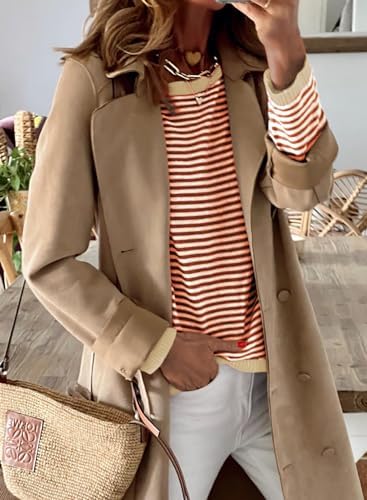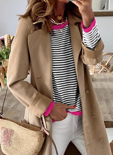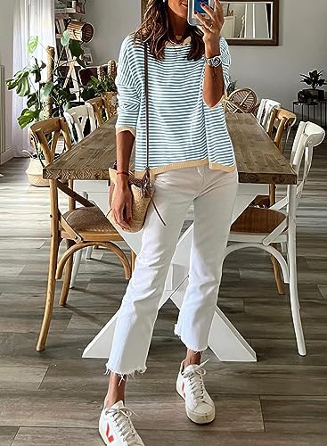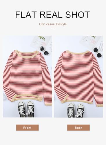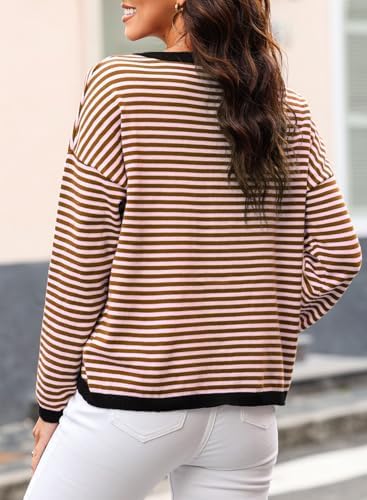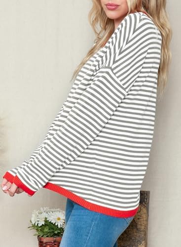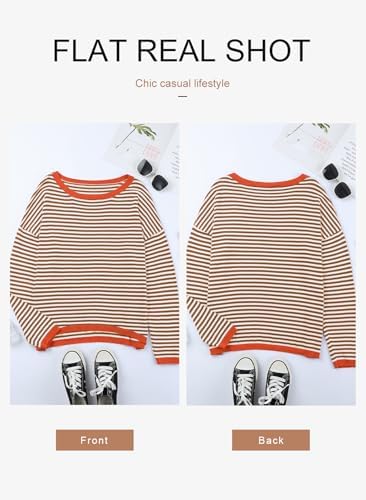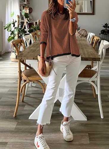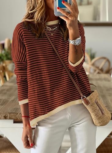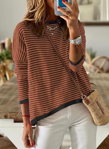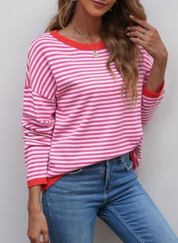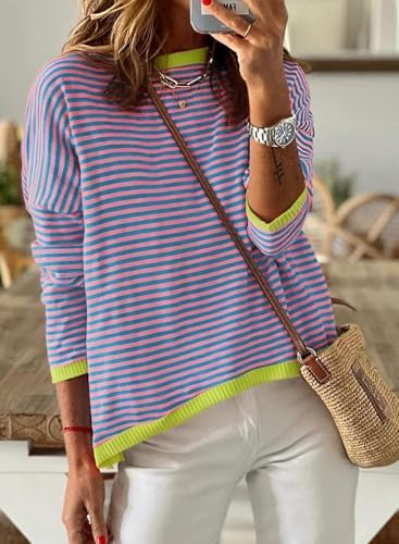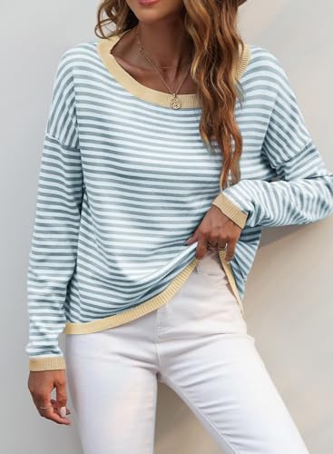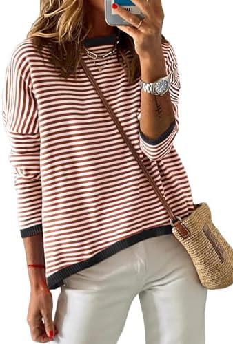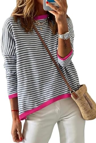 Dokotoo Womens 2024 Long Sleeve Tops Sweaters Casual Crewneck Striped Color Block Drop Shoulder Cotton Pullover Shirts