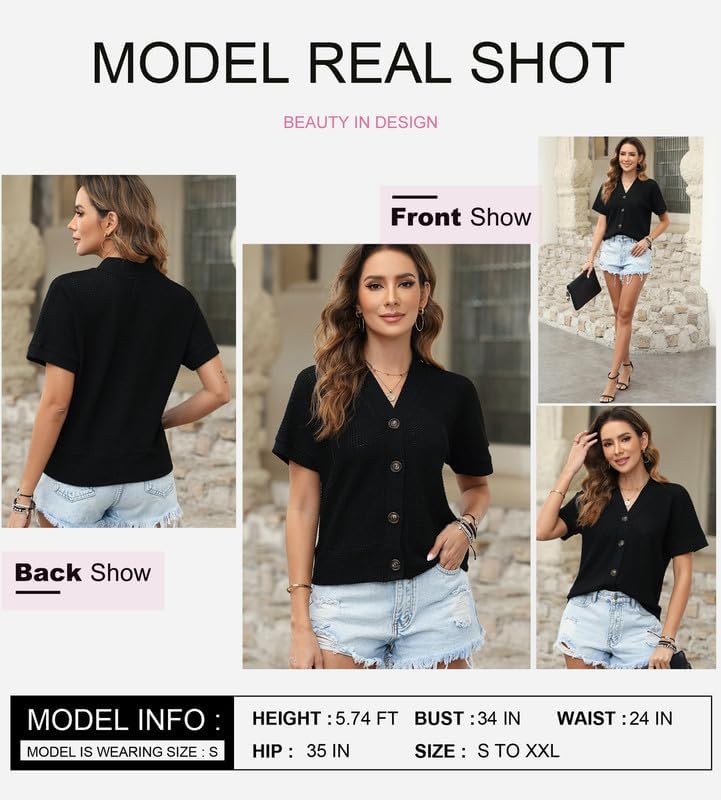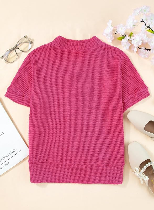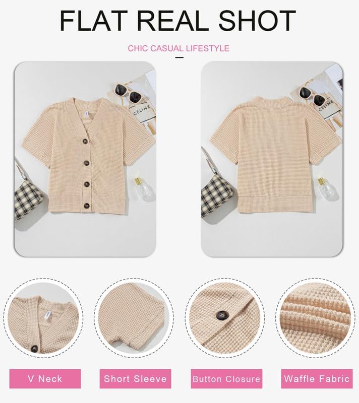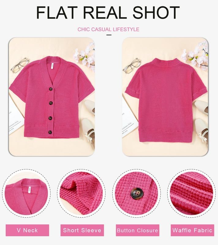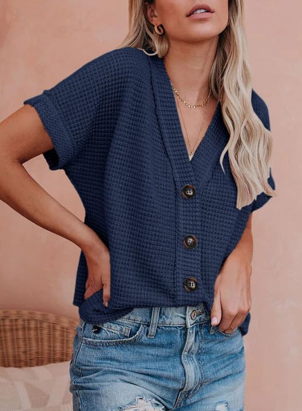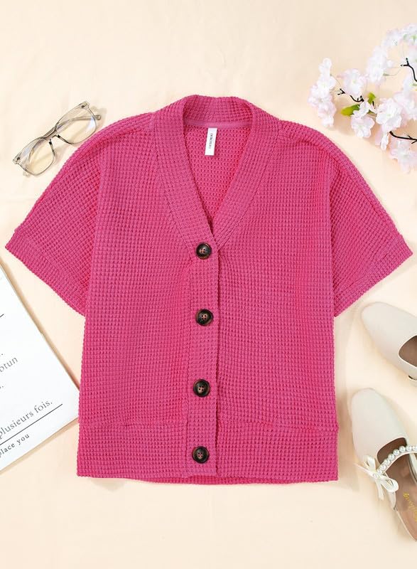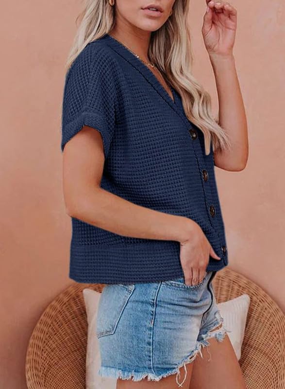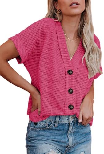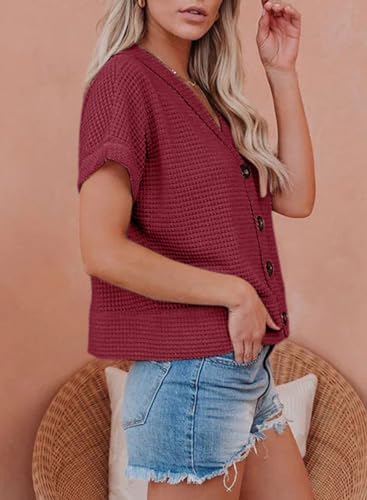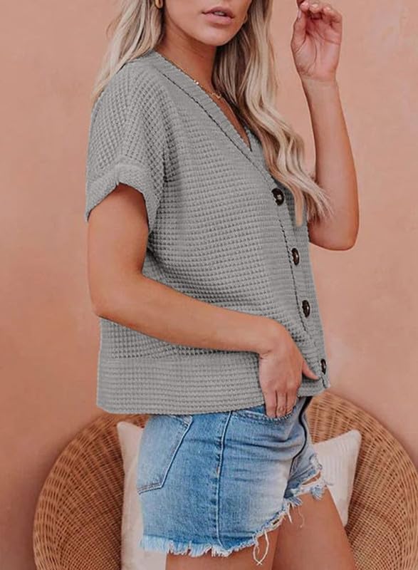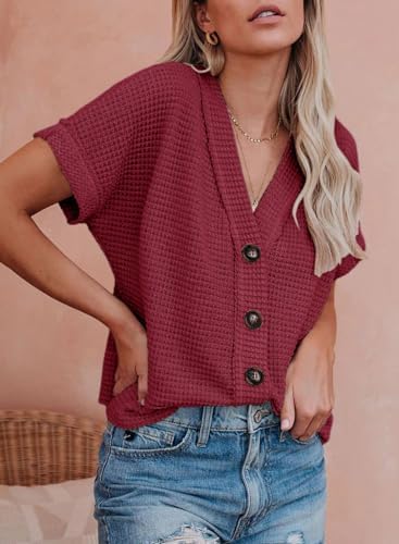 Dokotoo Womens Summer Tops 2024 Waffle Knit Button Down Shirts Casual V Neck Short Sleeve Shacket Jacket Dressy Blouses