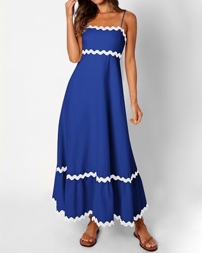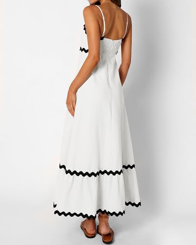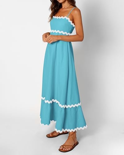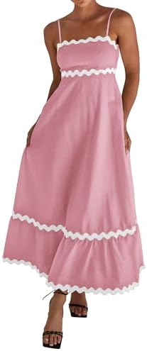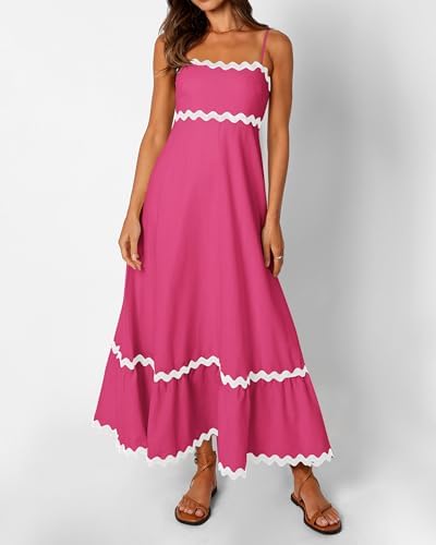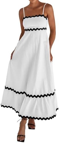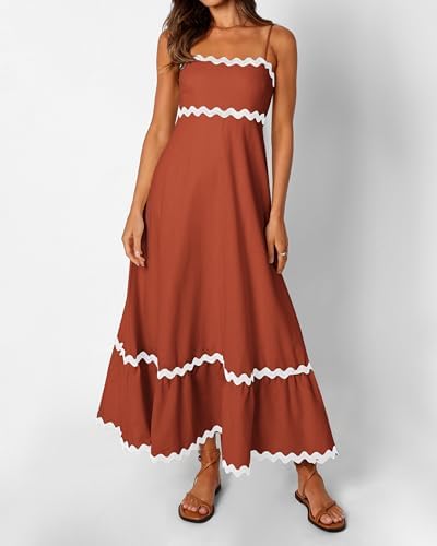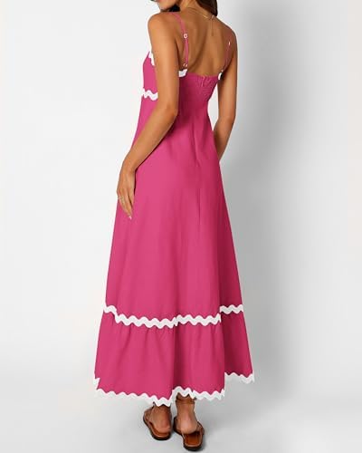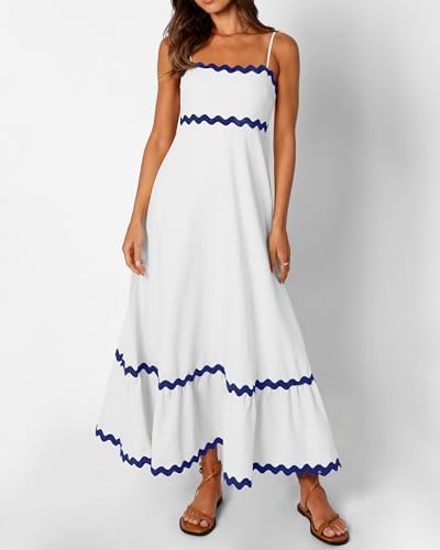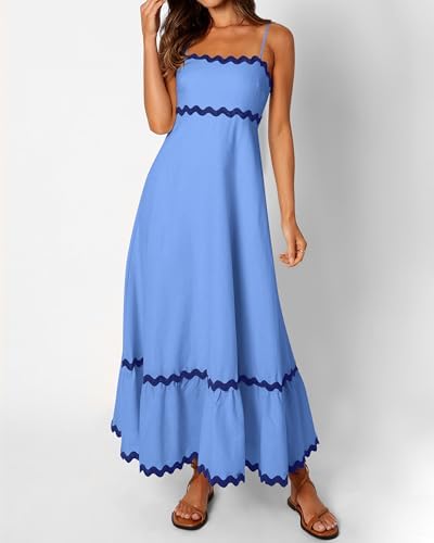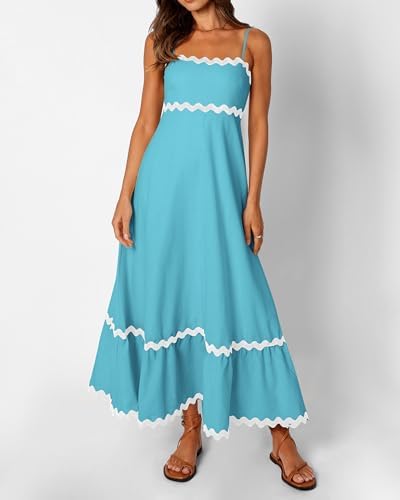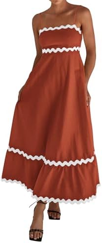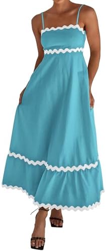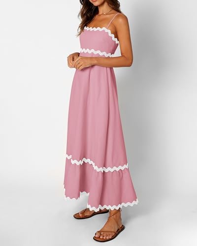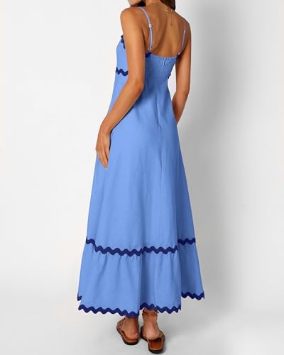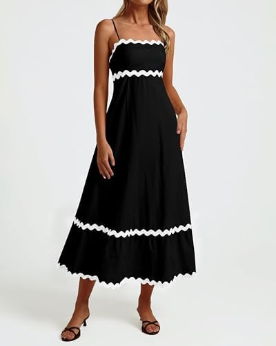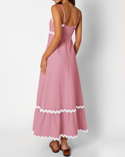 dowerme Women Summer Dresses 2024 Spaghetti Straps Sleeveless Smocked Rickrack Trim Boho Flowy Loose A-Line Midi Dress