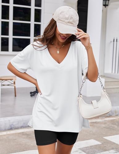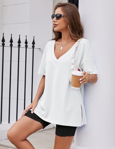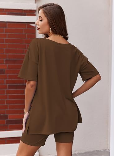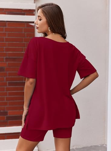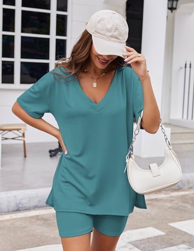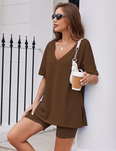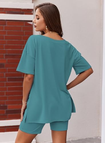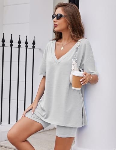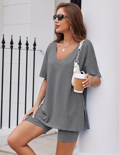 Ekouaer Womens Pajamas 2 Piece Lounge Sets Oversized V Neck T-Shirts Tops Biker Shorts Set Workout Reversible Tracksuit S-XXL