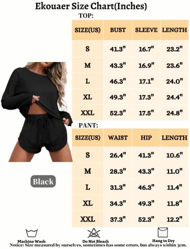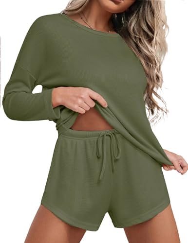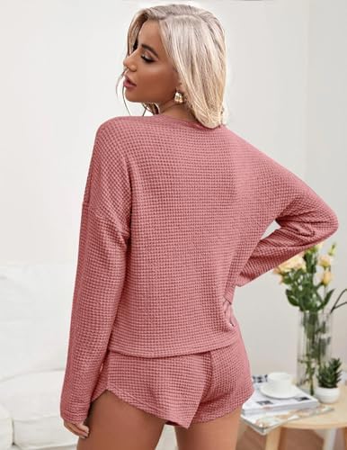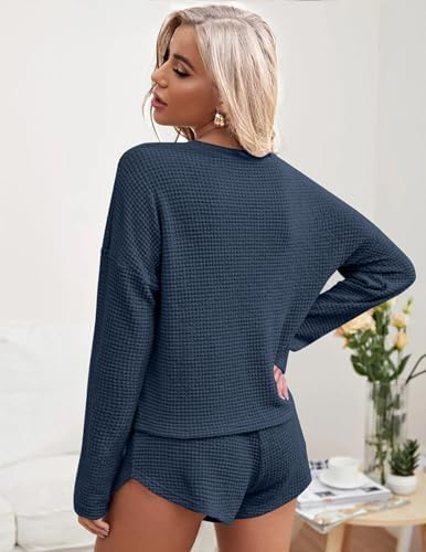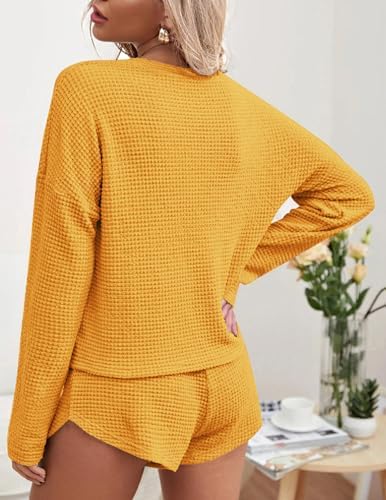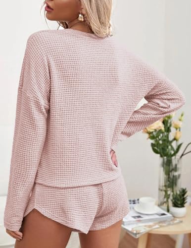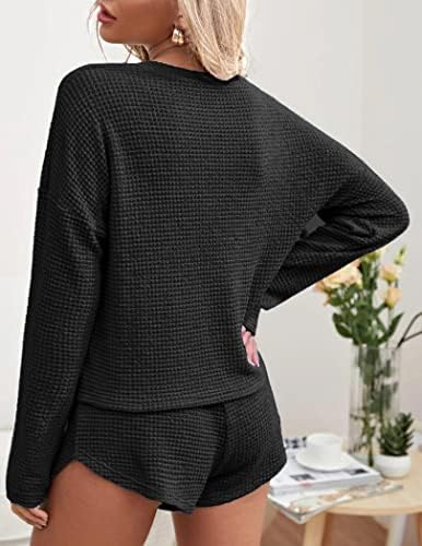 Ekouaer Womens Waffle Knit Pajama Sets Long Sleeve Top and Shorts Matching Lounge Set Loungewear Sweatsuit with Pockets