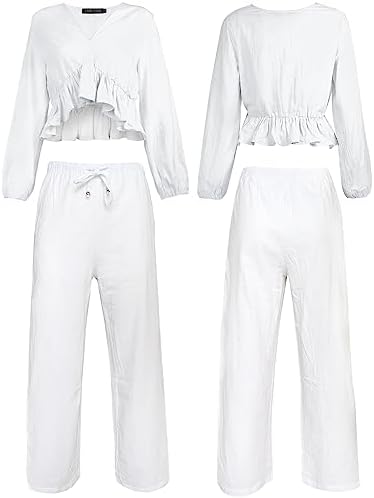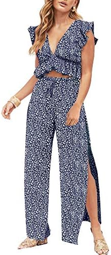 FANCYINN Womens 2 Pieces Outfits Deep V Neck Crop Top Side Slit Drawstring Wide Leg Pants Set Jumpsuits