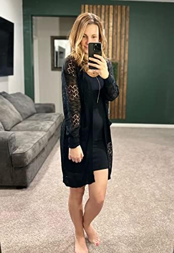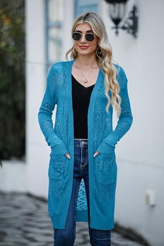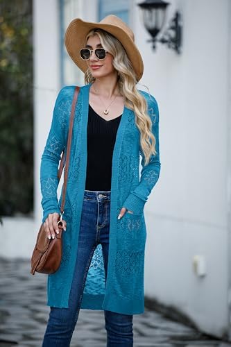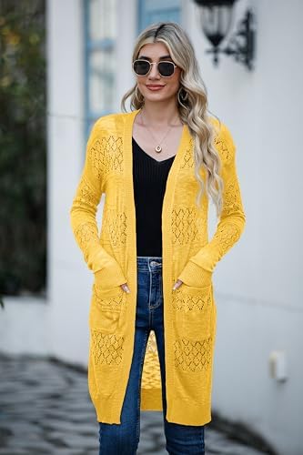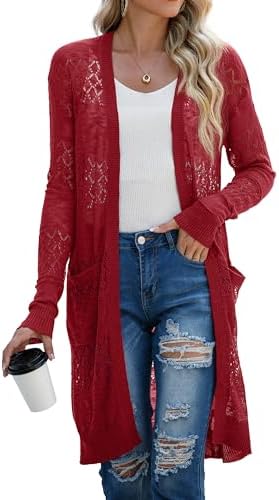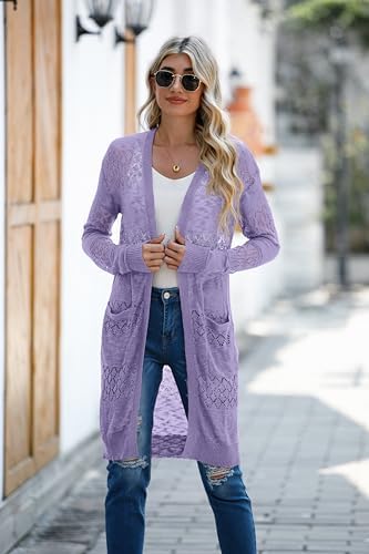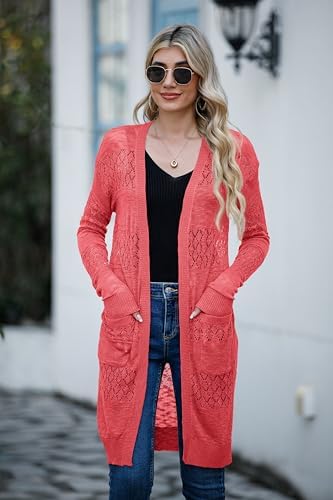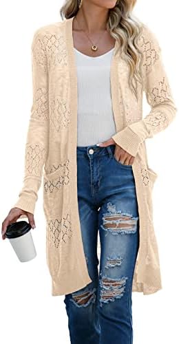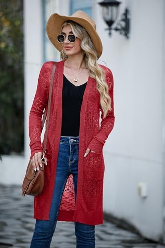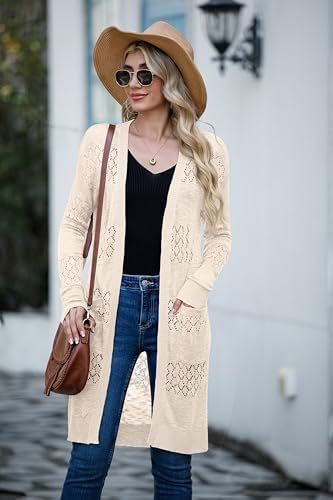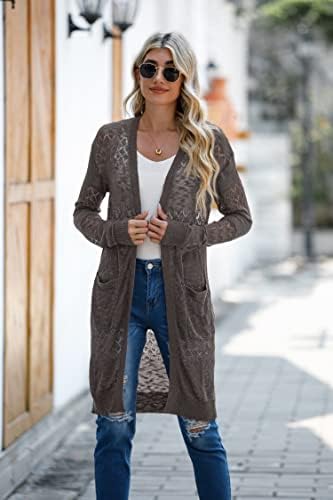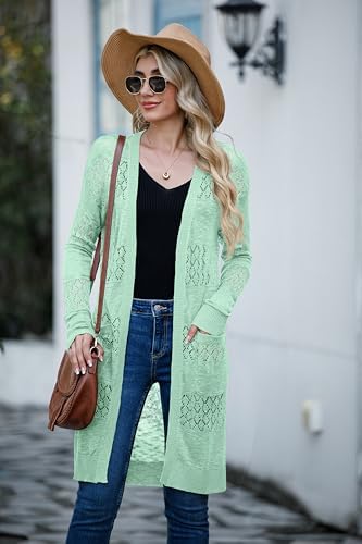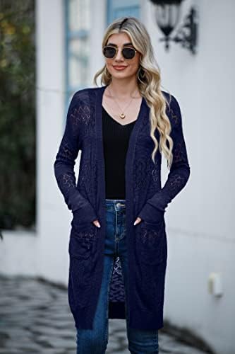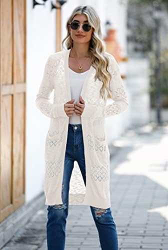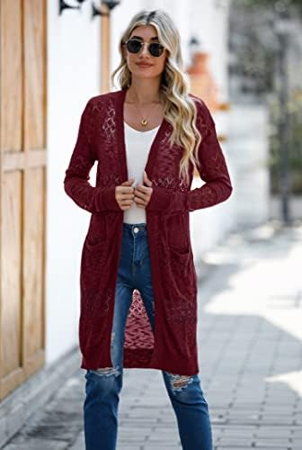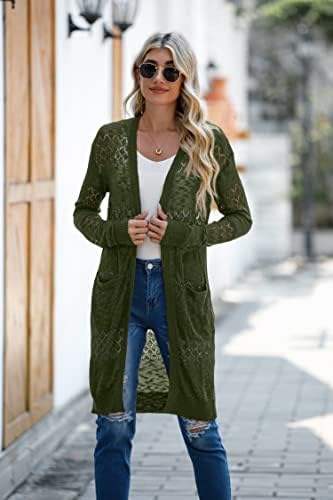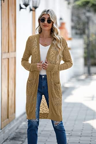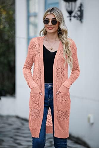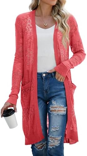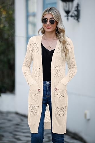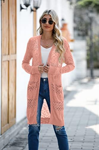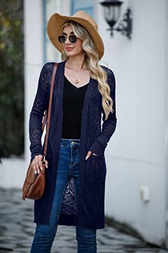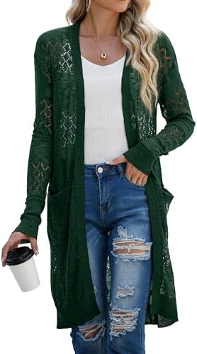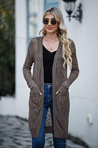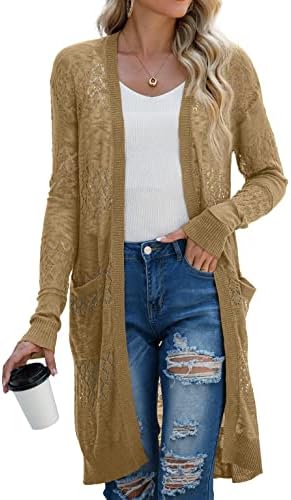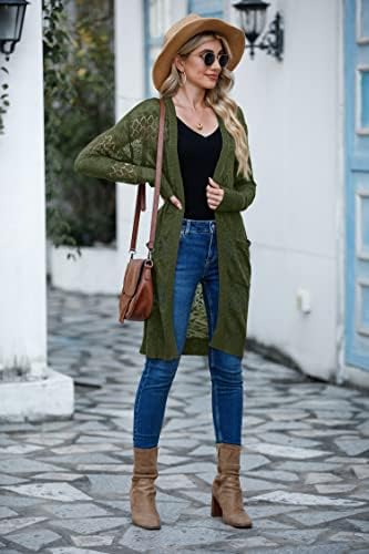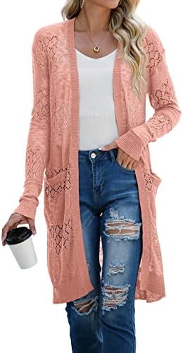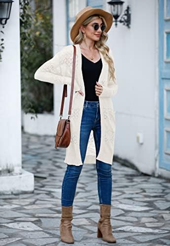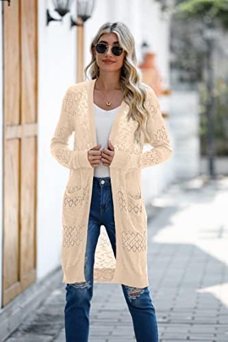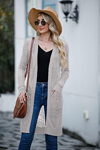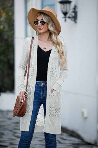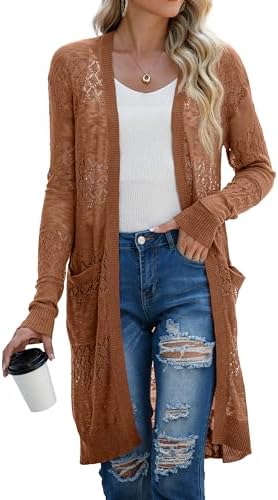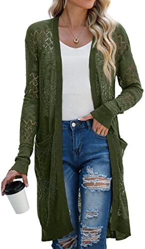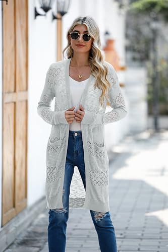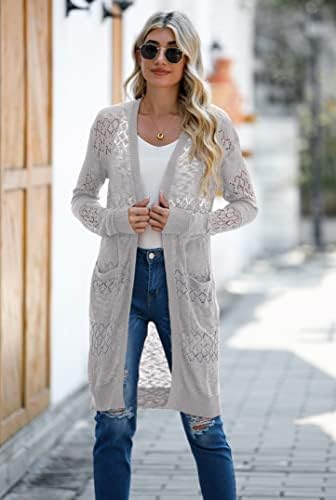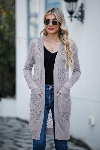 GRECERELLE Womens Lightweight Longer Length Cardigan Long Sleeve Casual Crochet Open-Front Sweater with Pockets
