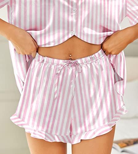 HOTOUCH Womens Satin Pajamas Set Button Down 2 Piece Silk Pjs Shorts Set Ruffle Lingerie Notch Collar Sleepwear