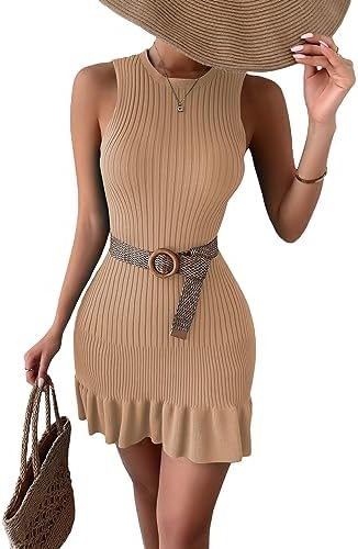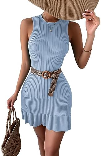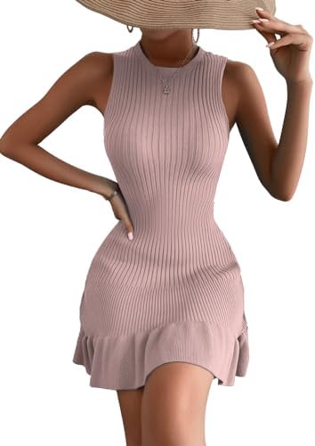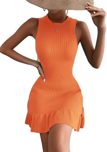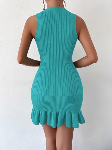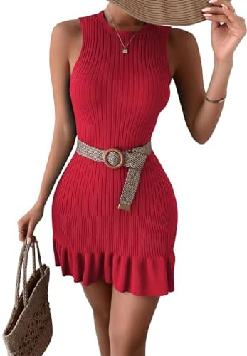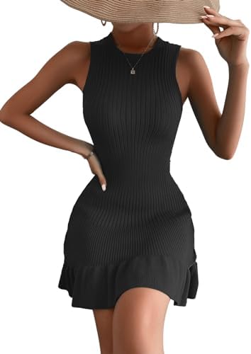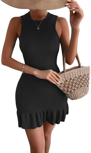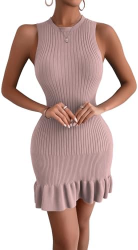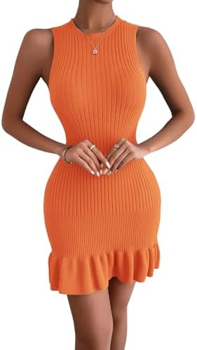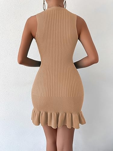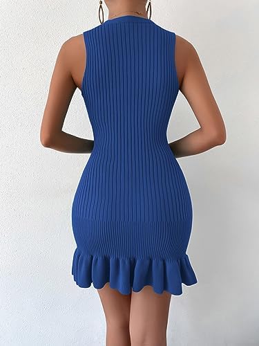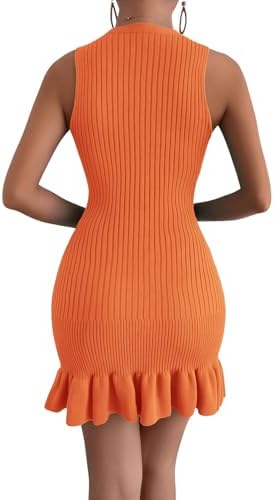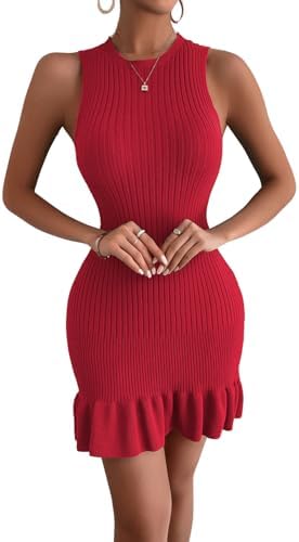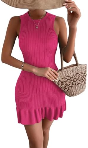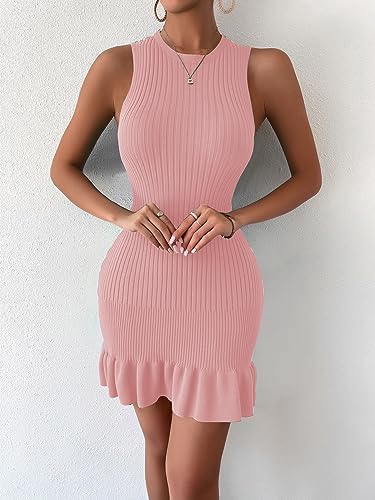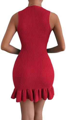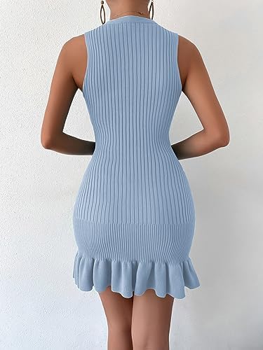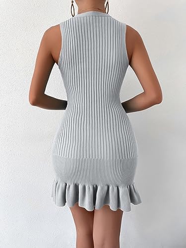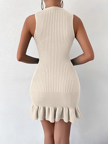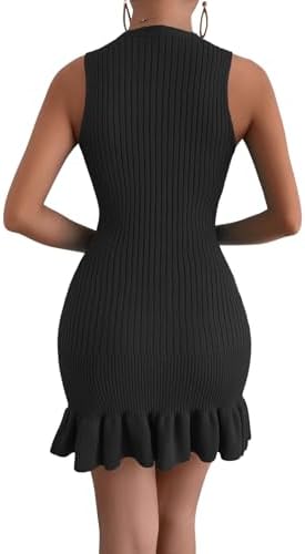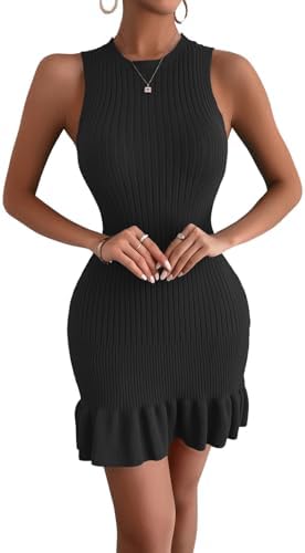 MakeMeChic Women's Sleeveless Sweater Dress Ribbed Knit Ruffle Hem Mini Dress Bodycon Crochet Dress