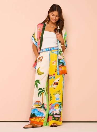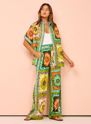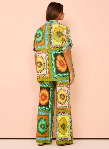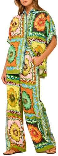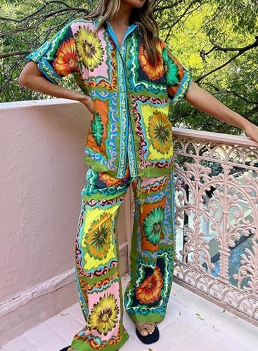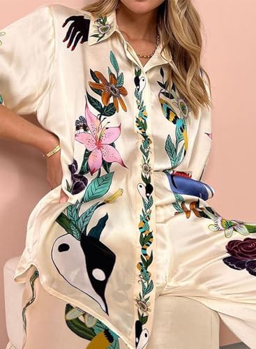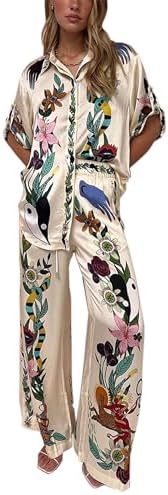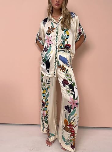 Peaceglad Women's Summer Print Two Piece Pajama Set Short Sleeve Button Down Tops Drawstring Long Pants Sleepwear Sets