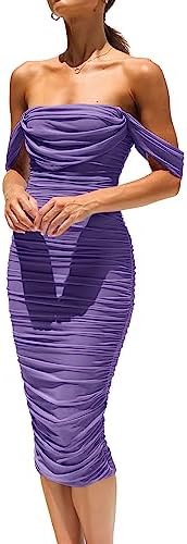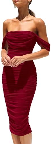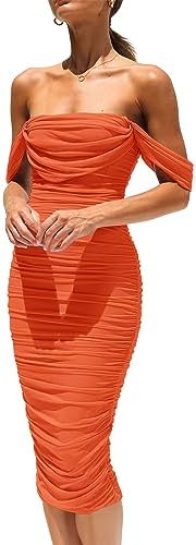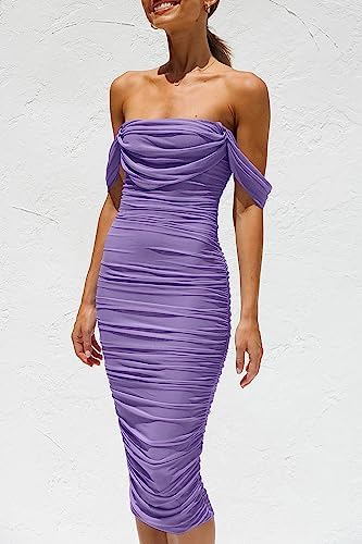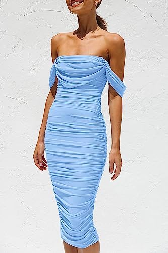 PRETTYGARDEN Womens Summer Off The Shoulder Ruched Bodycon Dresses Sleeveless Fitted Party Club Midi