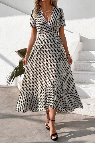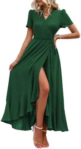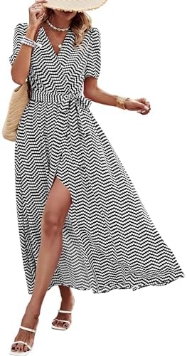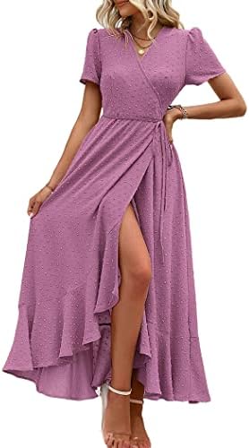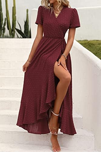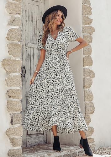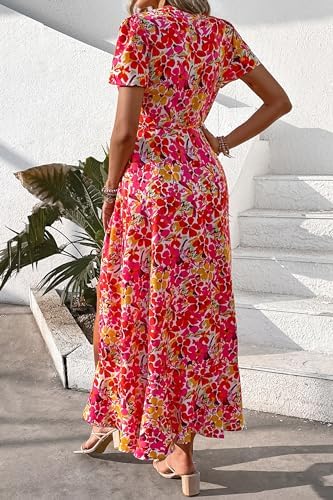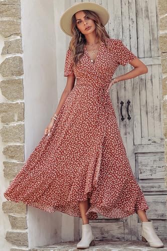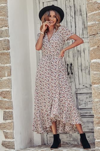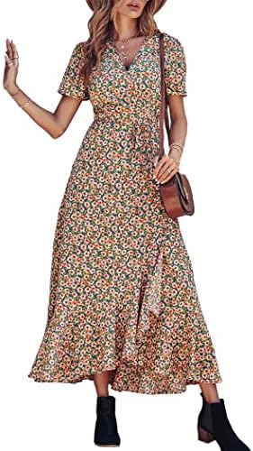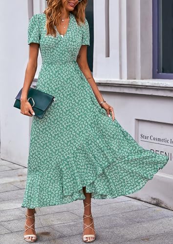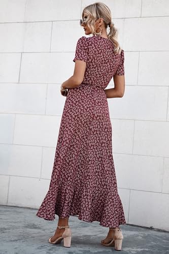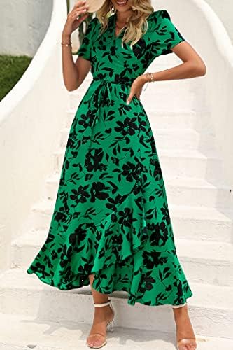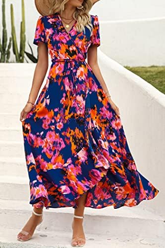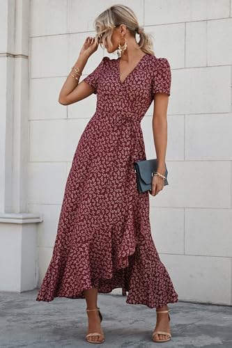 PRETTYGARDEN Womens Summer Wrap Maxi Dress Casual Boho Floral V Neck Short Sleeve Ruffle Hem Split Beach Long Dresses