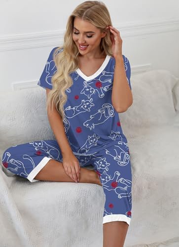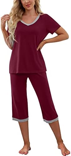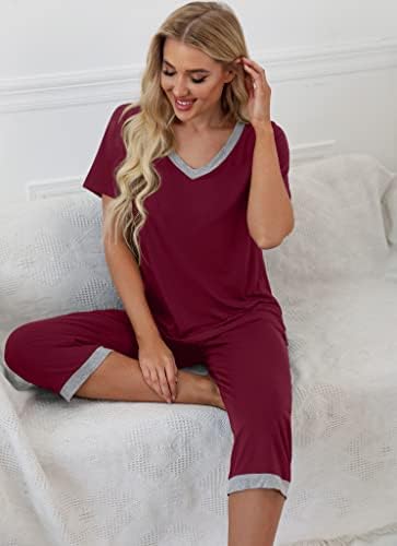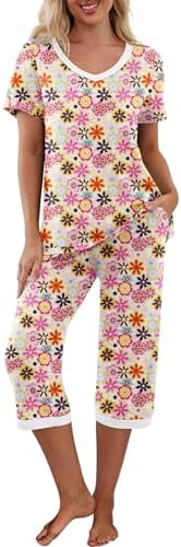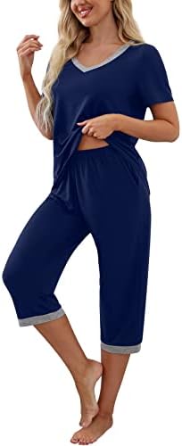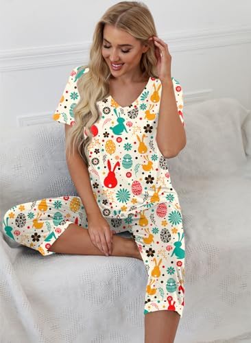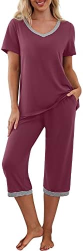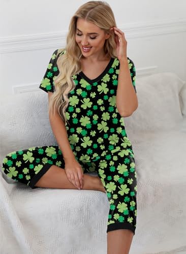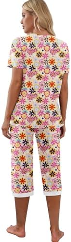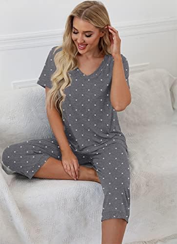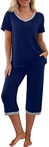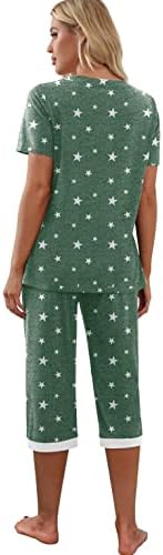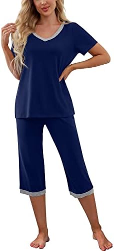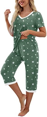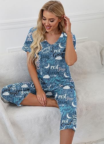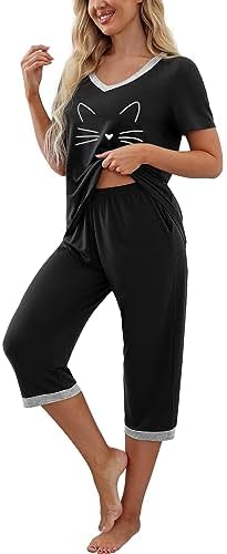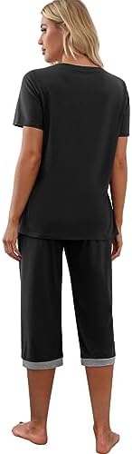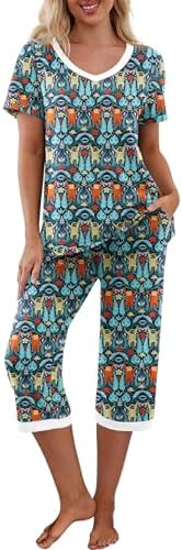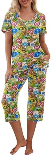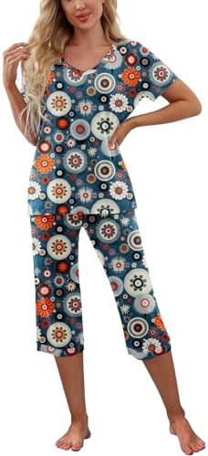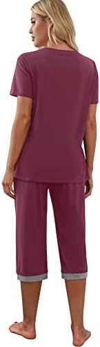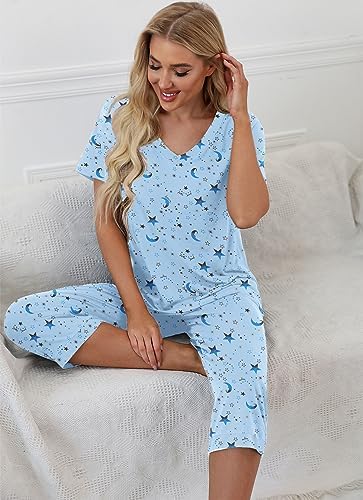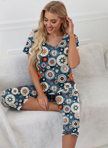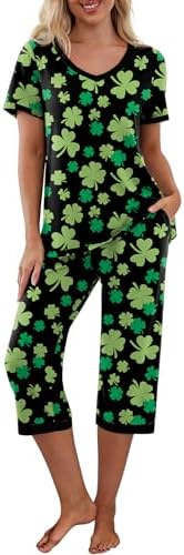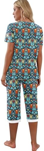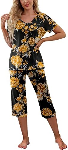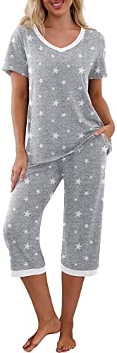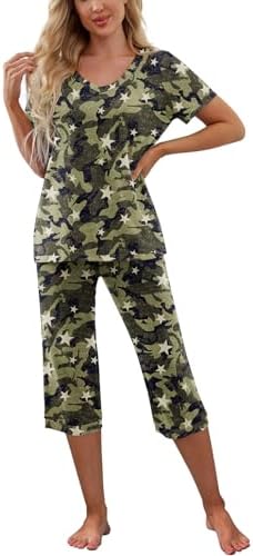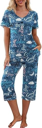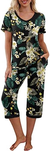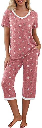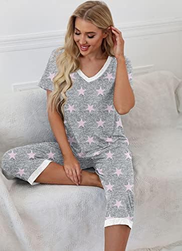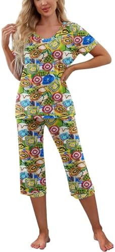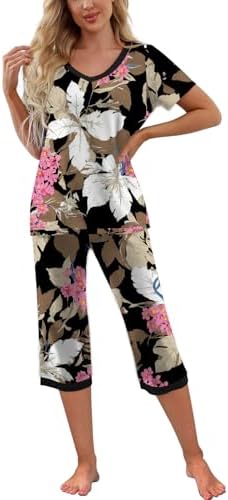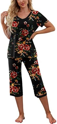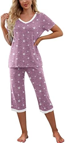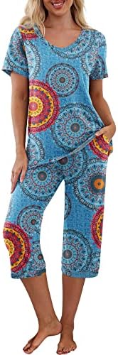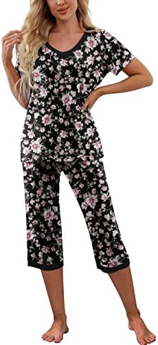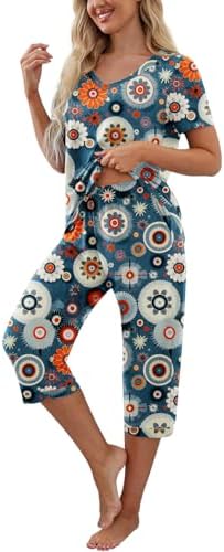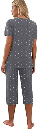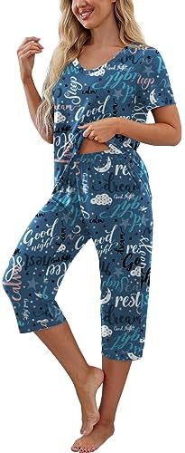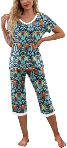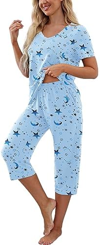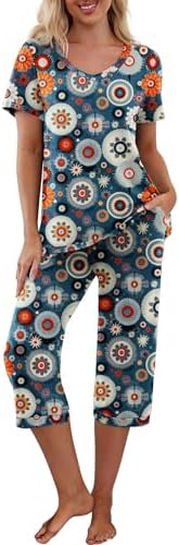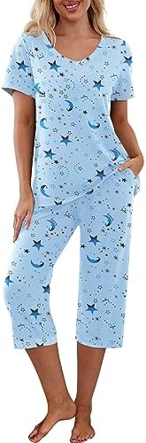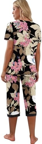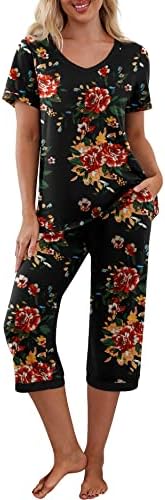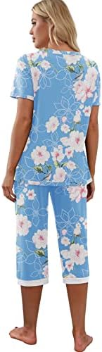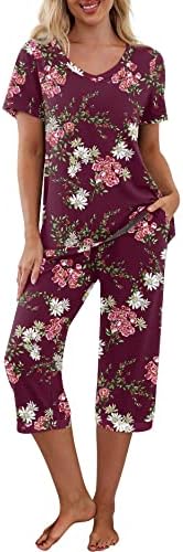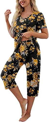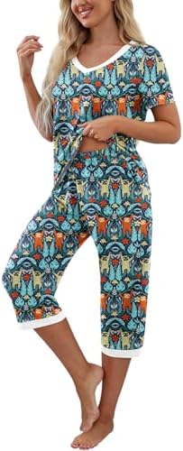 PrinStory Women's Pajama Set Short Sleeve Shirt and Capri Pants Sleepwear Pjs Sets with Pockets
