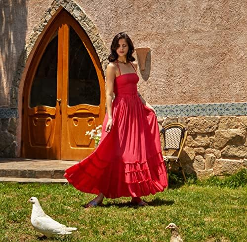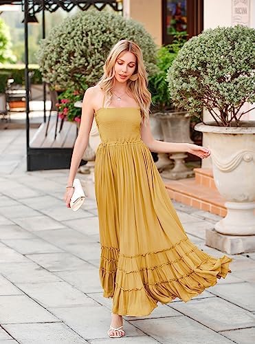 chouyatou Women's Retro Plaid Smocked Dress Spaghetti Strap Flounce Long Dress
