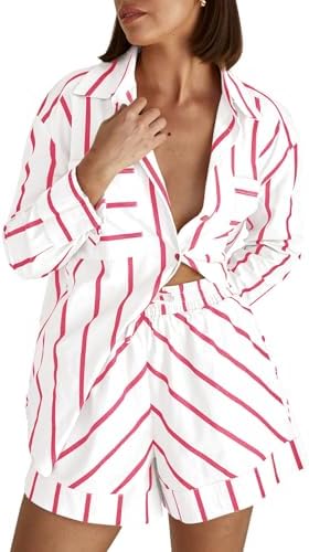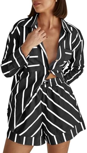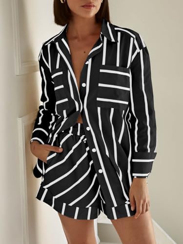 Tankaneo Womens Striped 2 Piece Outfits Button Down Shirts and Shorts Lounge Set