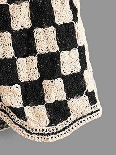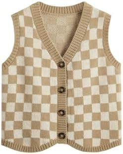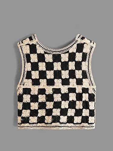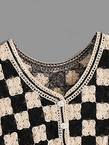 Verdusa Women's Button Front V Neck Sleeveless Crochet Plaid Checkered Knit Sweater Vest