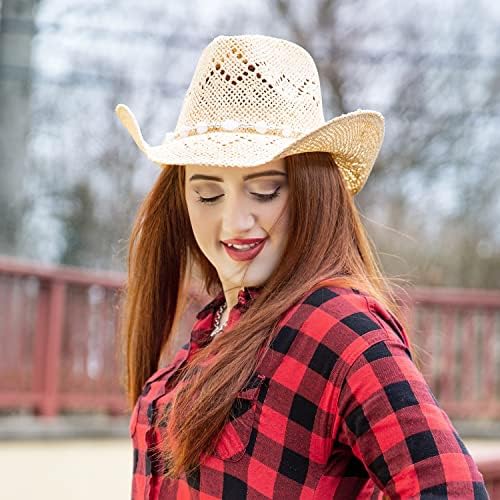 Western Cowgirl Hat, Straw Cowboy Hat for Women with Shapeable Brim, Beaded Hearts Trim, Shapeable Cowboy Hat
