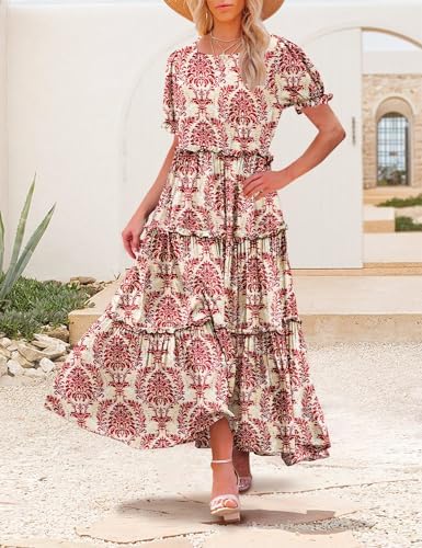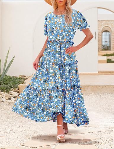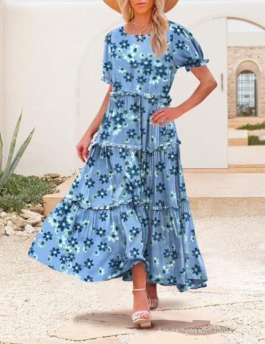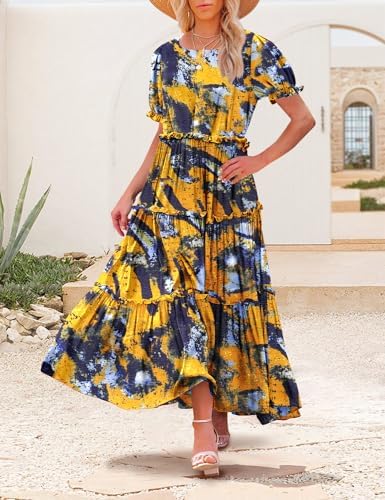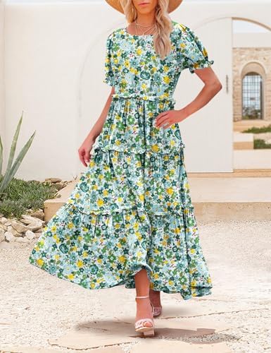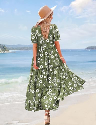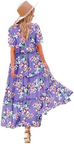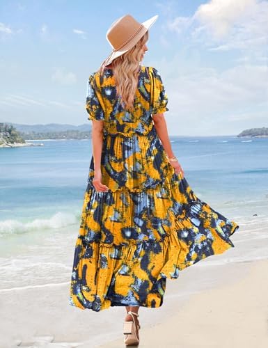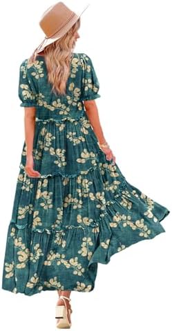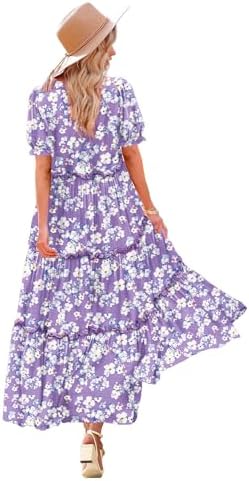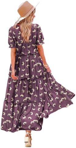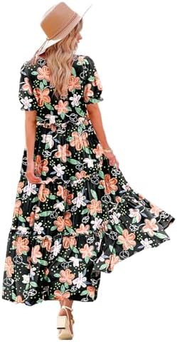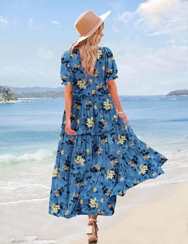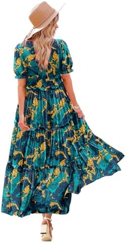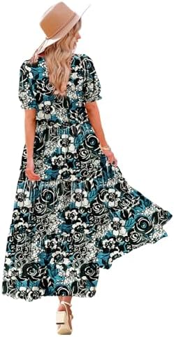 YESNO Summer Casual Bohemian Floral Dresses for Women 2024 Puff Short Sleeve Long Maxi Dress with Pockets ETX