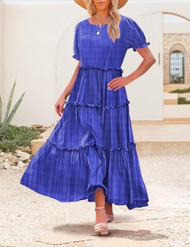 chouyatou Women's Retro Plaid Smocked Dress Spaghetti Strap Flounce Long Dress